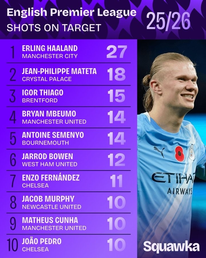 此外,切尔西的恩佐·费尔南德斯以11次射正位居第七,表现稳健;而纽卡斯尔联的雅各布·墨菲和曼联的马修斯·库尼亚,以及切尔西的若昂·佩德罗三人,均以10次的射正数踏入榜单,显示出他们在关键时刻的威胁。