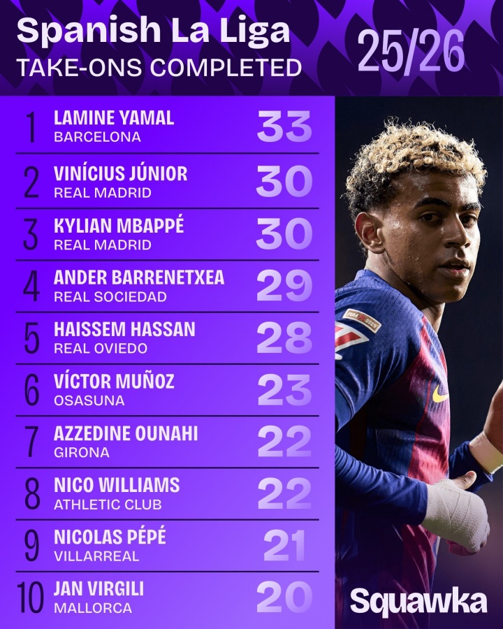 在这个如同梦幻般的西甲赛季中,亚马尔居然凭借强大的个人能力,以33次的过人次数,傲视群雄,成为了霸主。想想看,这小子简直就像是禁区里的幽灵,随便一个闪现就能甩掉对手,简直让人目不暇接。而他身后的维尼修斯和姆巴佩,两位天赋异禀的魔法师,竟然都以30次的成绩并列第二,似乎在跟亚马尔玩“看谁能逼近你”的游戏,不过不管怎样,他们的表现都还算令人刮目相看。