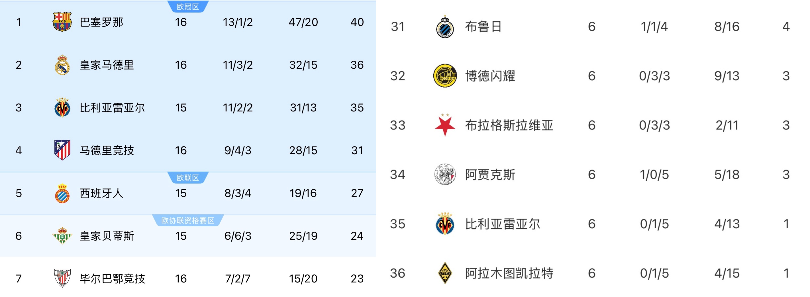 相比之下,西甲的情况则显得有些暗淡,五队的场均拿分仅为1.33分,排名明显落后。其中,皇家马德里和马德里竞技各积12分,但巴萨仅拿到10分,毕尔巴鄂5分,而排名第三的比利亚雷亚尔更是以仅有的1分令人失望。