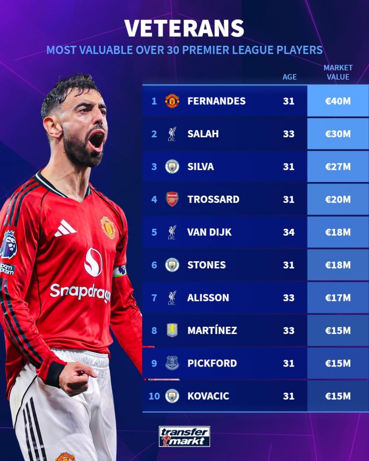在最近的统计中,德国转会市场发布了英超30岁及以上球员的身价排名,让我们来看看这些经验丰富的球员们在市场上的身价如何吧!