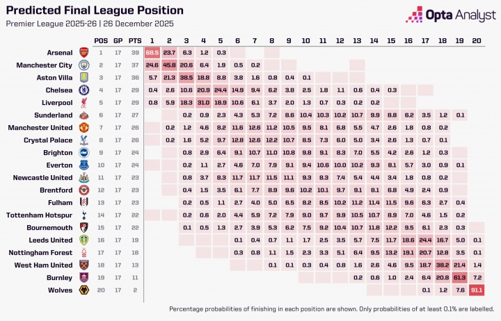 在12月27日,Opta超算发布了最新的英超夺冠预测,让我们来看一下目前的形势。阿森纳在这一轮的预测中,继续以68.5%的概率稳居第一,展现出了强劲的夺冠希望。曼城以24.6%的概率紧随其后,毫不示弱,他们依然是夺冠路上的重要竞争者。