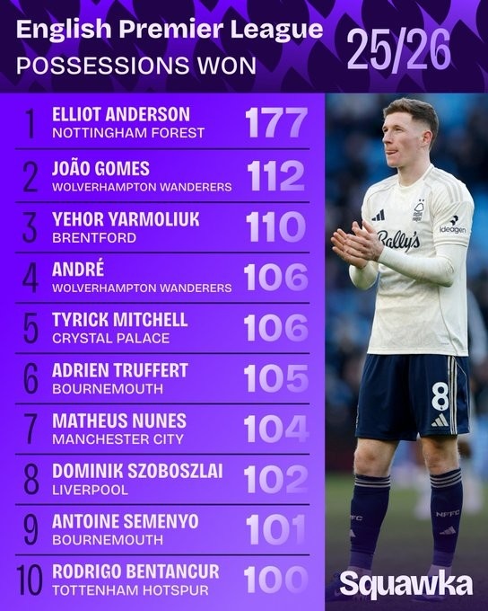根据1月10日的最新报道,数据机构Squawka提供了本赛季英超联赛中各球员赢得球权的统计数据,其中诺丁汉森林的中场球员埃利奥特·安德森表现备受瞩目,以177次的成绩独自位居榜单首位。