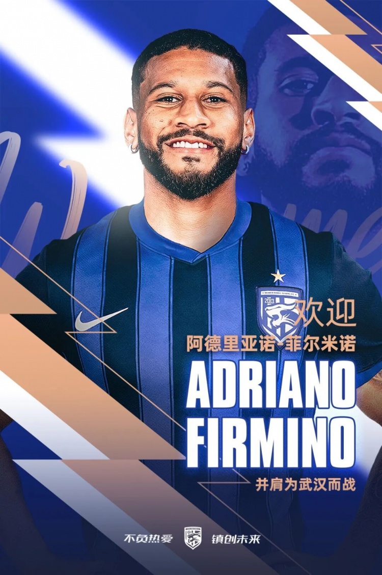 欢迎阿德里亚诺-菲尔米诺加入武汉三镇大家庭,期待这名中场新星能够迅速融入队伍,与队友们共同迎接未来的挑战。