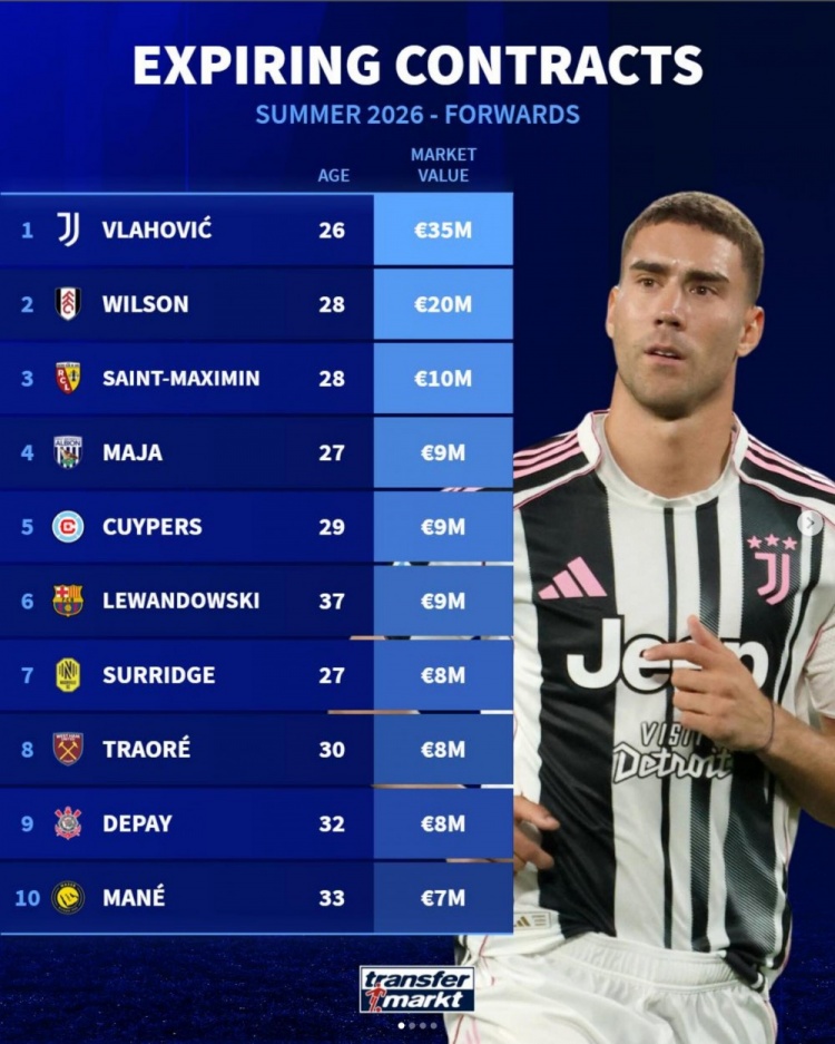 今夏合同到期的十大前锋球员身价德转排名,弗拉霍维奇以3500万欧元位居第一_意甲直播