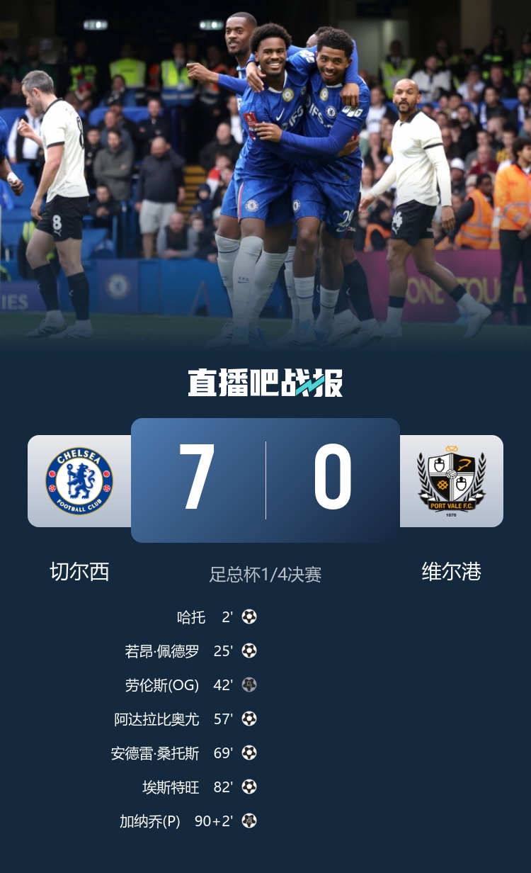 在北京时间4月5日凌晨0:15,足总杯1/4决赛于斯坦福桥激情上演,切尔西迎战维尔港。本场比赛如同一场狂欢盛宴,切尔西在主场大显神威,以7-0的悬殊比分结束了此前的四连败,昂首晋级足总杯四强。