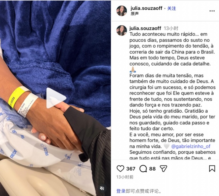 如今,加布里埃尔的妻子在社交平台上分享了他们从受伤到治疗的过程,记录了这一段令人心痛的旅程。她以Vlog的形式,将这一切浓缩成影像,用亲身的感受传达出她的心声:“一切来得太意外……在这几天里,从比赛的冲击,到肌腱的撕裂,再到迅速返回巴西开始治疗,虽然一切都来得那么匆忙,但我坚信,上帝始终在我们的身边,给予我们无尽的支持和力量。”