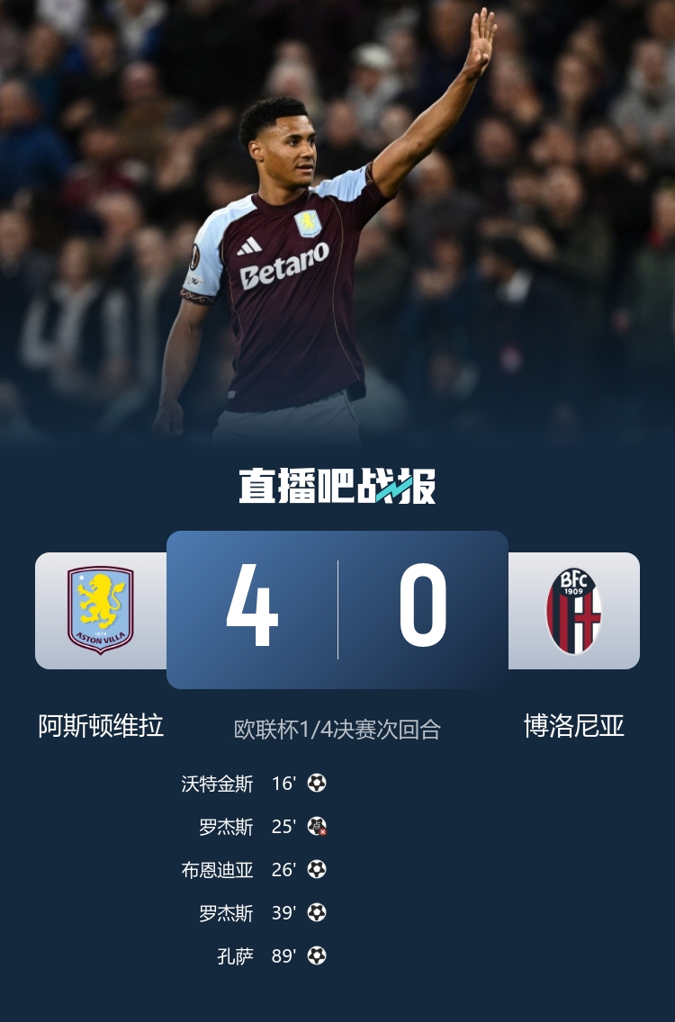 在4月17日的欧联杯1/4决赛次回合中,阿斯顿维拉在主场维拉公园球场迎战博洛尼亚。首回合,维拉以3-1占据优势。本场比赛的进展顺利,维拉表现出色,以4-0的比分战胜博洛尼亚,总比分7-1顺利晋级半决赛,接下来将对阵诺丁汉森林。